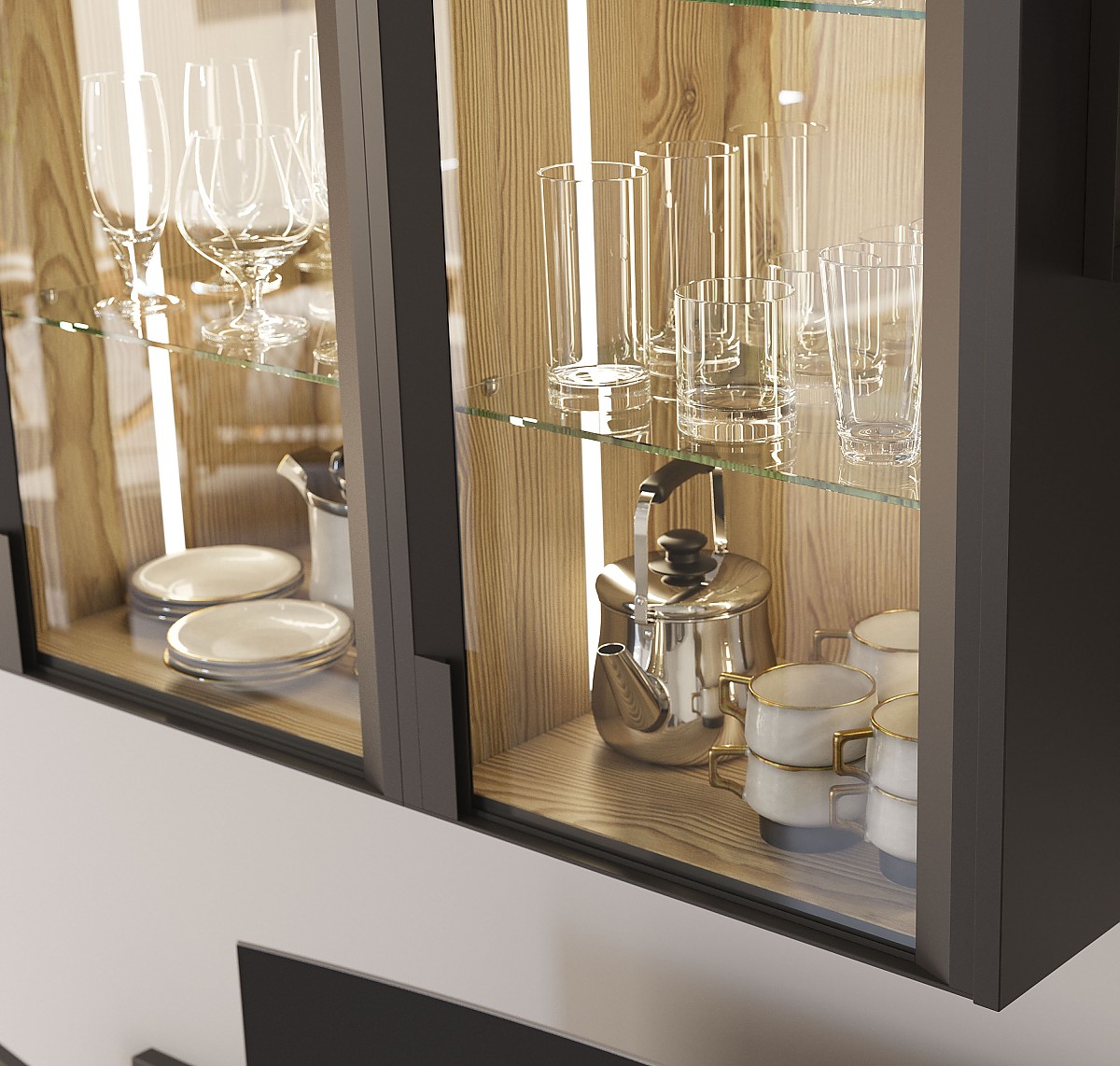 A iluminação tanto horizontal quanto vertical em elementos decorativos com portas de vidro valoriza ainda mais a funcionalidade do módulo. Observamos uma combinação de elementos que podem ser dispostos tanto na cozinha quanto na sala de estar. Destacamos a proposta de design dos módulos decorativos com vitrine BOLD juntamente com a estante Q20.