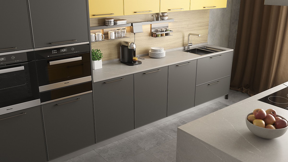 A organização dos utensílios para a preparação de alimentos com o sistema de gavetas Elegance pode ser ampliada com uma organização complementar na bancada, utilizando o perfil multifuncional do organizador Mosaiq.