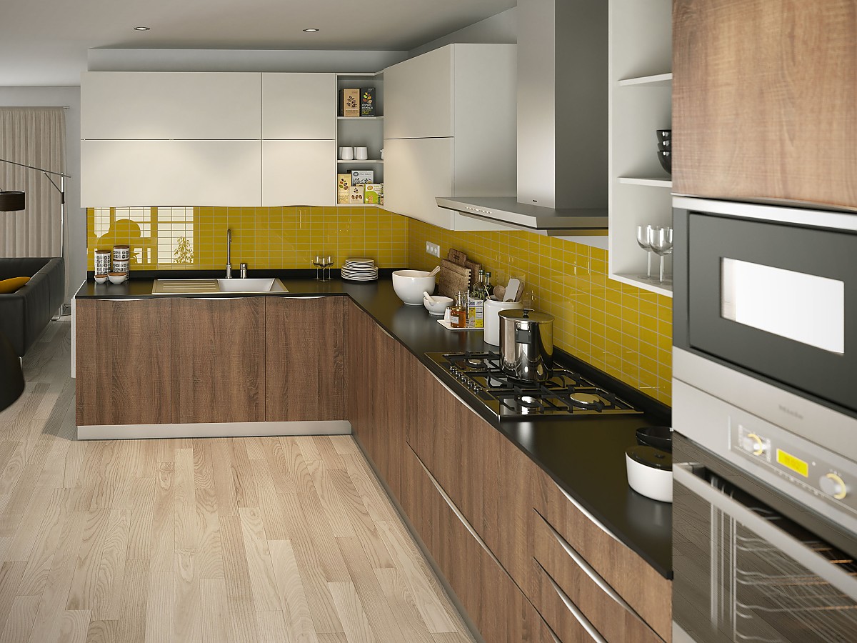 A disposição do mobiliário em forma de L permite obter uma composição lógica, confortável e eficiente, com as áreas operacionais em frentes diferentes.
